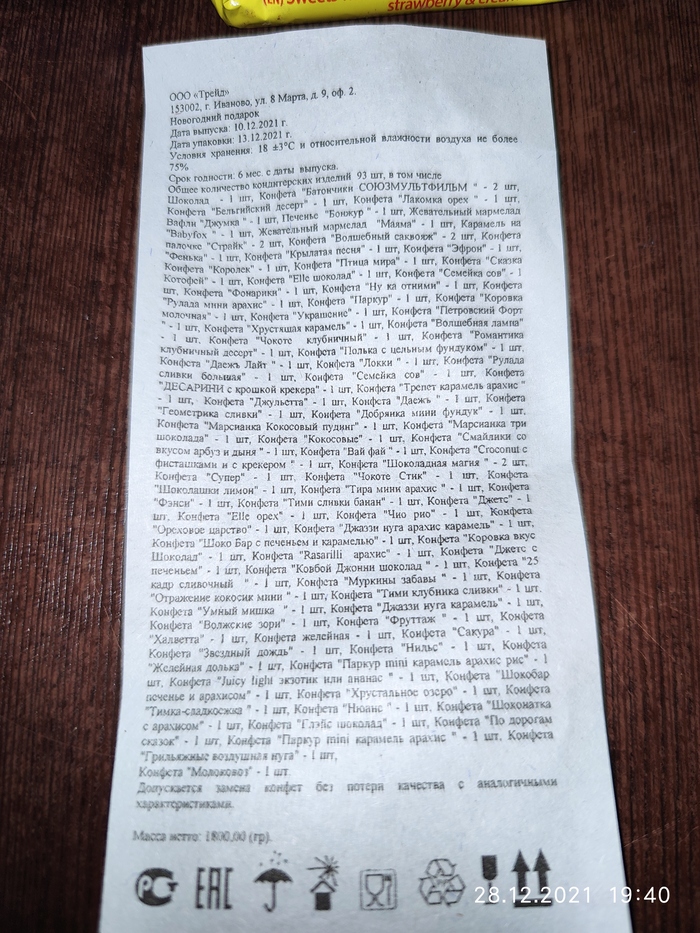Конфеты фоткать не стал, со списком совпадают. Выдали детям в детских садах и школах с 1 по 4 классы. Про тех детей, кто не ходит в детский сад, ничего не могу сказать, получили ли они подарки или нет.