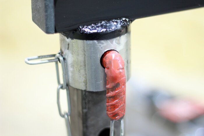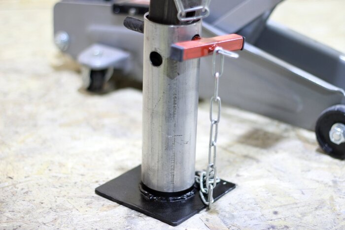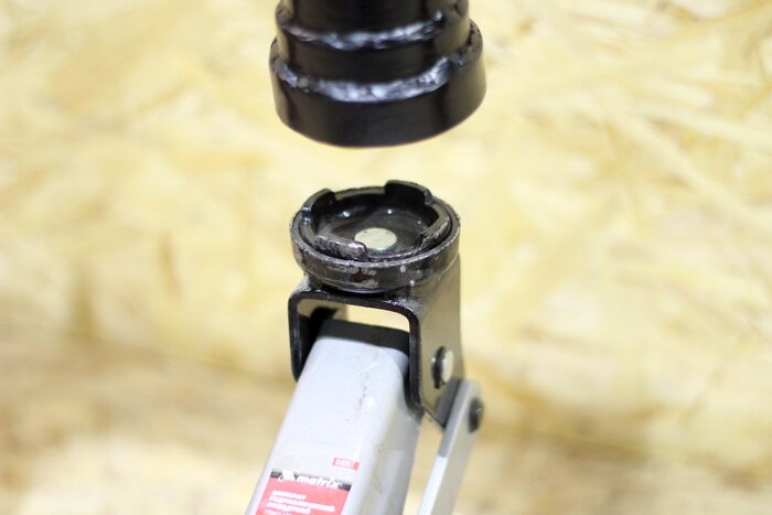 Фиксация хвостовика (штока) домкрата происходит путем погружения в опорный стакан. Он состоит из трубы диаметром 60мм и вваренным внутри квадратом 40х40. Также сделан кант, чтобы хвостовик домкрата не слетел.