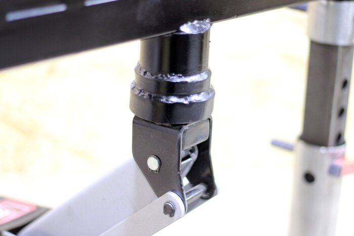 На стаканах опорных стоек высверлено по две пары отверстий с разбежкой. Путем поворота на 90 градусов можно более точнее зафиксировать стойку. Именно поэтому была выбрана конфигурация квадрат в трубе.