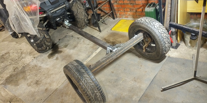 Итак, силовая балка выполнена из профильной трубы 40x40 с толщиной стенки 2мм. Длина балки 60см. Я прикинул, что это оптимальная ширина, чтобы эти же стойки использовать для вывешивания квадроцикла.