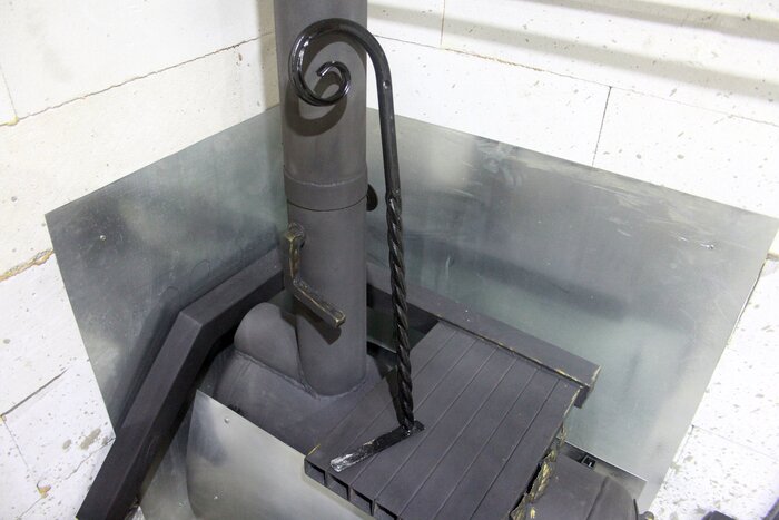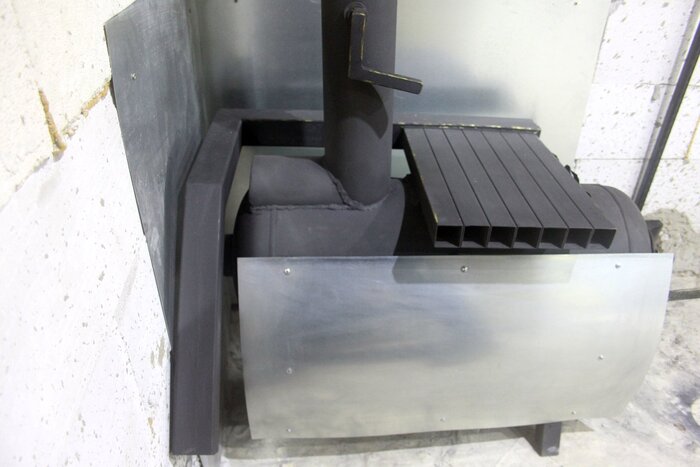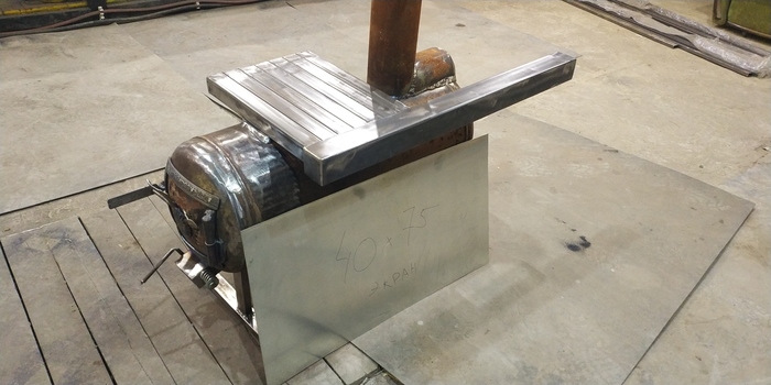 В итоге получилась вот такая печка. "Хвостик" для забора холодного воздуха. Туда подсоединилась гофра, которая забирает воздух из под верстака.