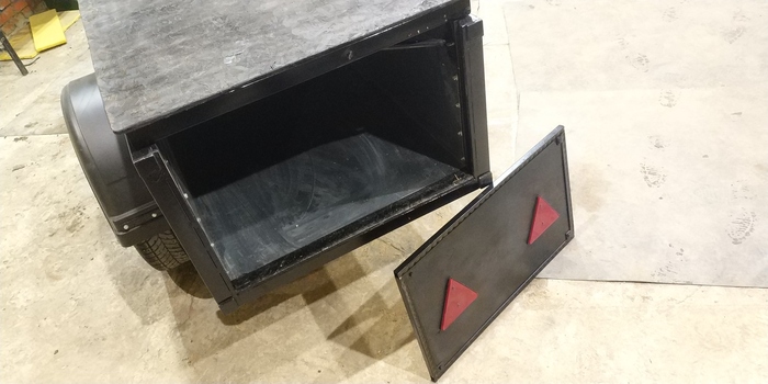 Запорный механизм простой и надежный - барашек М16. Автозащелку пока не сделал, т.к. прицеп еще не прошел ходовые испытания и, скорее всего, его ждет доработка. Есть мысли гуся поставить и лебедку прикрепить.