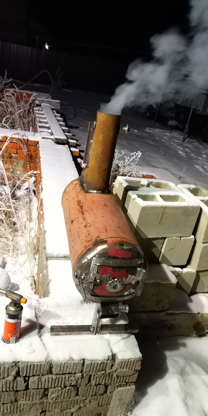 Ну и целом - всё. Еще раз скажу - теплообменник из такого же баллона будет. Вся трасса дымохода разборная получилась, также и будущий теплообменник будет съемным для прочистки.