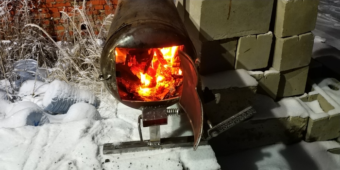 Поддувало по типу шибера шириной 40*80 мм. Использовал шпильку, кругляк и пружину от клапана. Обязательно внутрь вварил рассекатель - уголок 32*32. Т.к. однажды при тестировании оттуда вылетела не хилая такая искра)