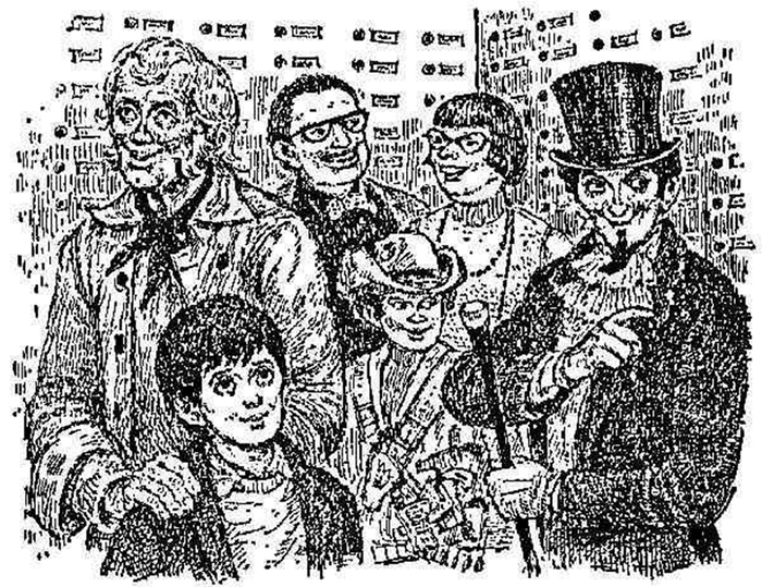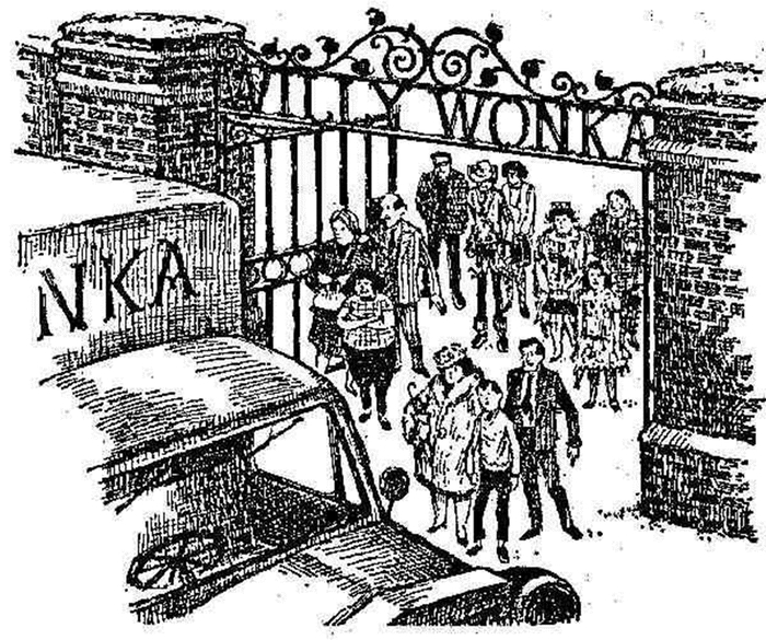 Перед воротами фабрики мистера Вилли Вонки собрались огромные толпы людей. А около самих ворот в тройном кольце полисменов находились пятеро юных героев дня и те взрослые, которым выпала честь их сопровождать.