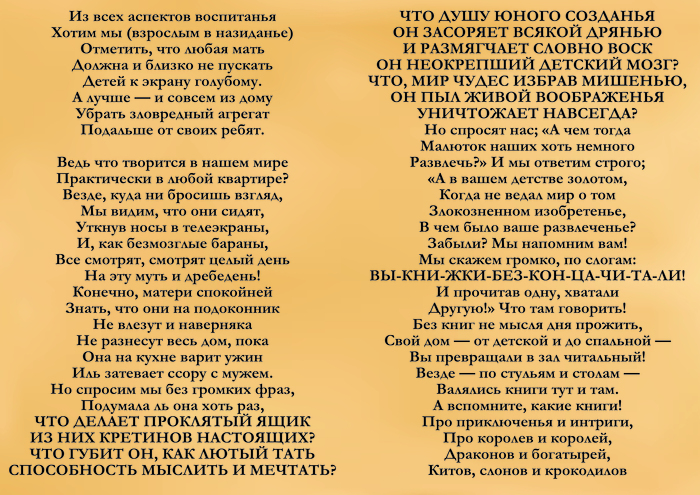 «Приветствую тебя, счастливый обладатель Золотого Билета! От души жму твою руку и искренне завидую тебе: скоро ты увидишь столько интересных вещей, столько чудесных сюрпризов! Я приглашаю тебя посетить мою фабрику, тебя и всех остальных, кому повезло найти один из моих Золотых Билетов. Я, Вилли Вонка, лично проведу вас по фабрике и покажу все, абсолютно все, а потом, когда настанет время расставаться, за каждым из вас последует грузовик. Эти грузовики, смею вас заверить, будут наполнены таким количеством лучших в мире сладостей, что и вам, и вашим друзьям хватит на многие-многие годы… Более того, даже если какое-то время спустя эти запасы иссякнут, вам достаточно прийти на фабрику и предъявить Золотой Билет — я буду просто счастлив дать вам все, все, что пожелаете.