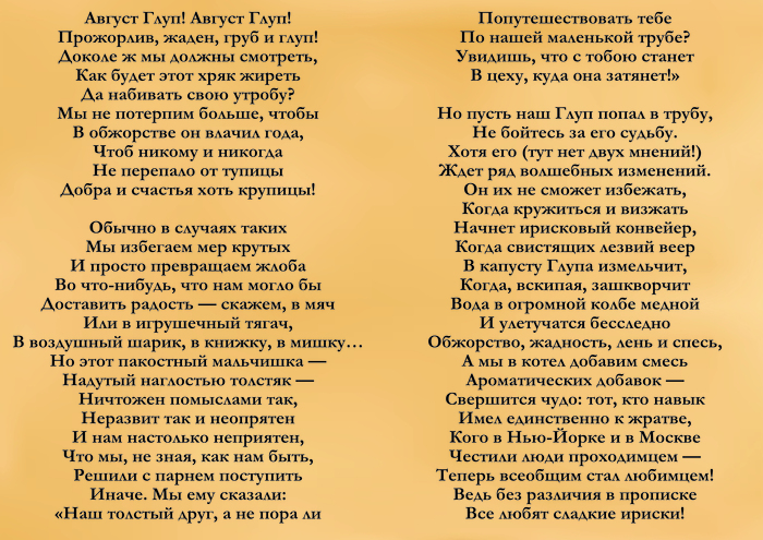 — Потому что вкус будет отвратительным! — заявил мистер Вонка . — Только представьте себе: земляничные ириски в шоколаде с начинкой из Августа Глупа! Никто и даром не захочет их брать!