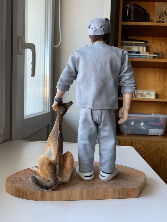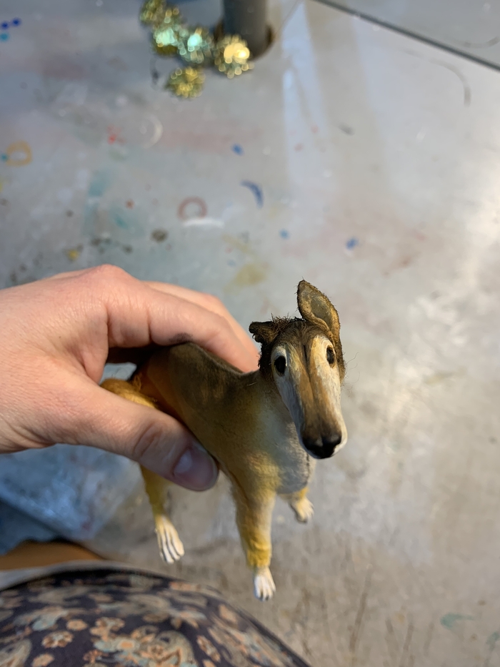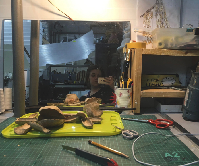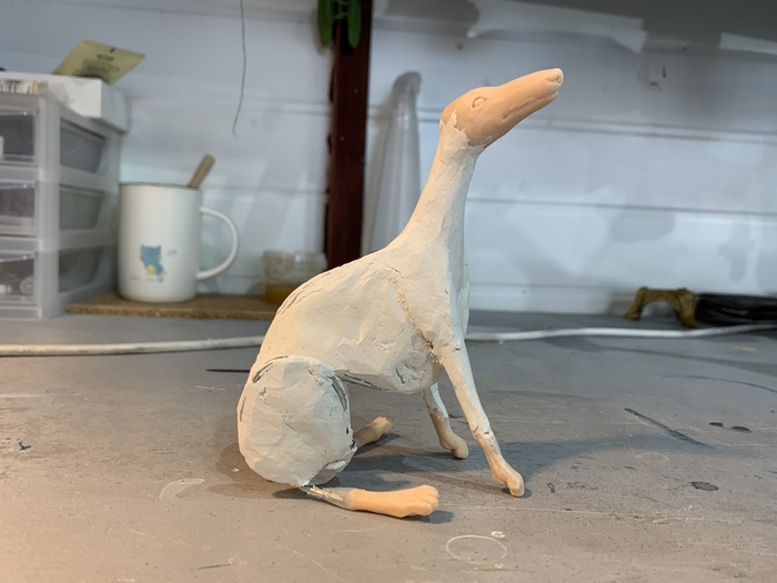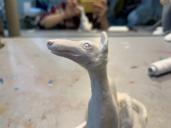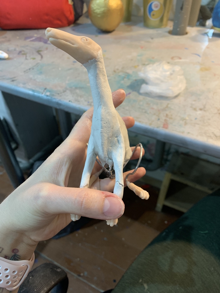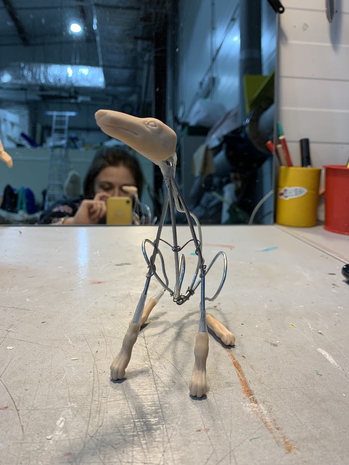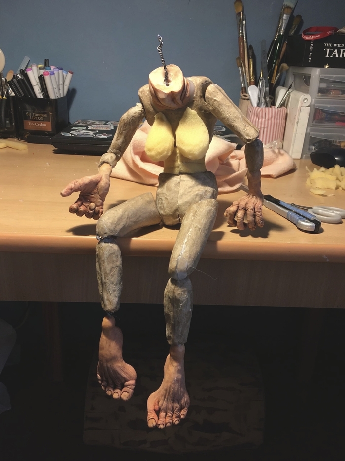 Все составляющие части ног, рук и корпуса были вырезаны из пеноплекса и обклеены папье-маше на несколько слоев, после чего каждая деталька разрезалась пополам, пеноплекс оттуда выколупывался и от этого этапа осталась только вот эта фотка моего рабочего стола: