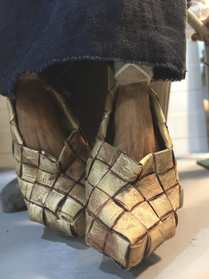 По заявкам сочинены съемные лапти - модифицированная модель лаптей из сувенирной лавки, на шнуровке, пришиты заплаточки и отделка на одёжку, вдеты серьги и таки сделана ступа: