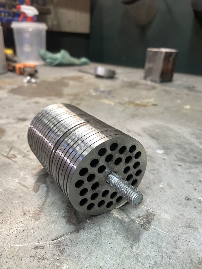 Привет!нашел на балконе пакет с кучей решеток от мясорубки ,ну и ,конечно же,решил сделать из них нож.Сталь хорошая,по итогу ,после закалки,царапает стекло и хорошо держит заточку. Собрал все эти решетки в пакет,отверстия заполнил железным порожком и под пресс.Далее уже формировал клинок,закаливал зонно в масле.Ручку изобразил из куска меди и дубового бруска.Отличный подарок товарищу на День Рождения.😂💪👍