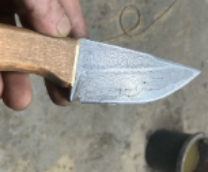 Привет!На днях выковал товарищу нож,просил якутский .Ну ,решил попробовать ,что выйдет.Проковал дол,закалил зонно в масле,чтобы сохранить эластичность обуха,сотворил ручку и заточил в линзу.Вернее сделал без режущий кромки ,плоскость с долом приходит в плоскость линзы и образует острие,заточка в бритву.понравился такой ножичек😂👍💪
