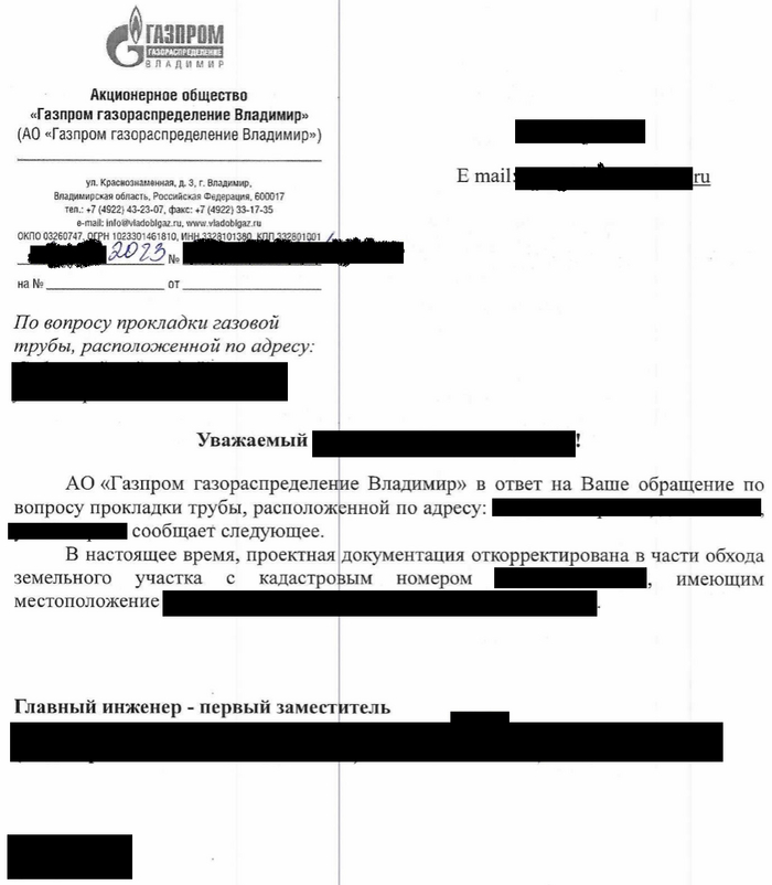 Я написал несколько писем, где буквально в 1-2 предложения описал проблему в свободной форме и попросил разобраться в ситуации: в администрацию поселения, в администрацию района, в Газпром и в ту фирму, которая собственно занимается прокладкой. Затем начал ждать ответов.