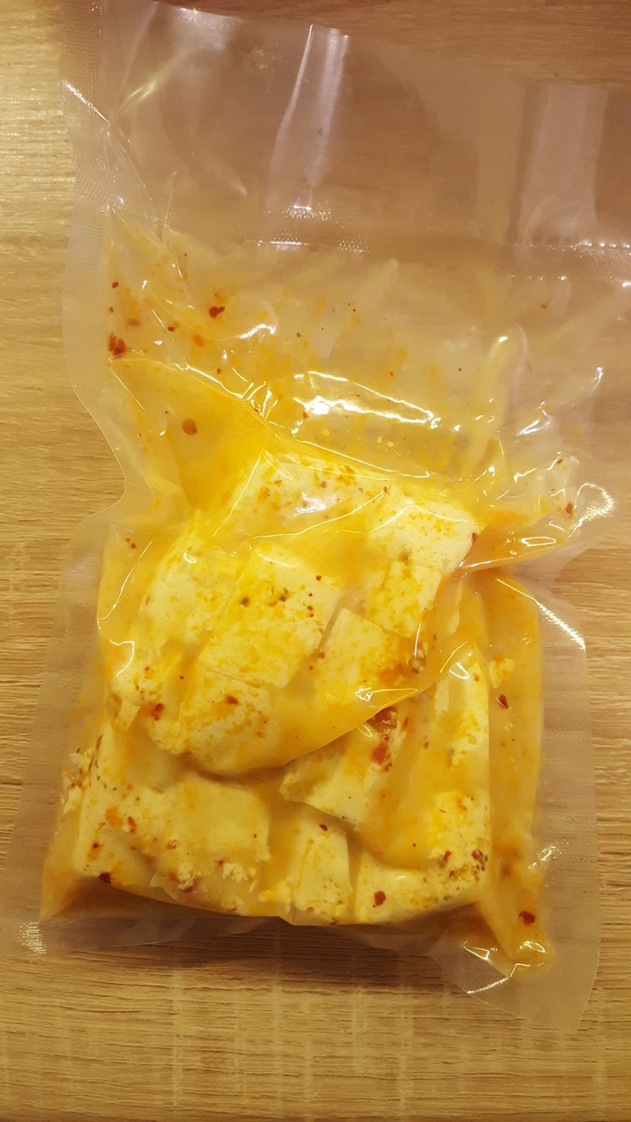 Что же касается тофу, то оно вообще не острое, скорее сладкое, а я не любитель таких сочетаний. Специи, в которых "плавает" тофу имеет довольно выраженный запах, текстура доввольно нежная, чуть рыхловатая.