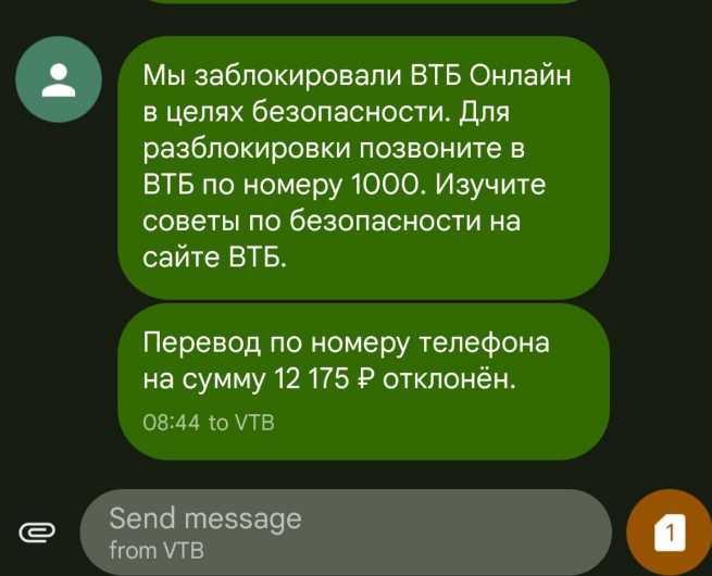 Коротко поговорили, сейчас очень много таких приходит с блоком, вроде это ЦБ анально карает банки, штраф полмиллиона за переводы мошенникам и требование выплатить потерпевшему всё, что он там переводил. Вот, думаю, ВТБ перебздел и на полную выкрутил своих роботов.