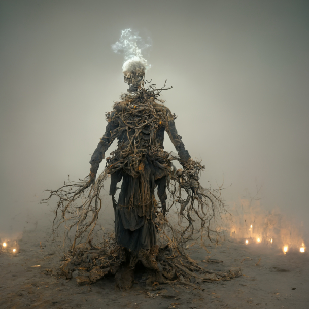 human with many heads, , ghosty , fantasy style, roots, smoke, wind, 8K resolution, fantasy setting, dramatic pose, character art, art style of WLOP + uplight, epic perspective, octane render, volumetric light, cinematic lighting, cinematic composition, render in unreal engine 5, 8k render, rule of third, dark epic scene, cinematic lighting