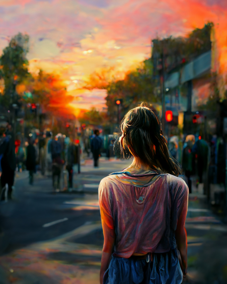 a girl on the street faceing backword and smile to him, 3D, sunset, hyper realistic, rule of third, full body