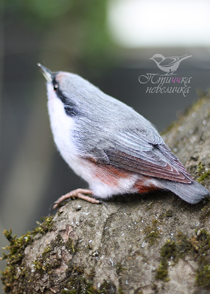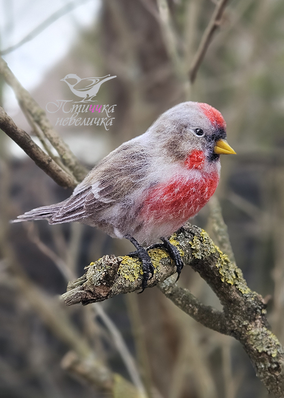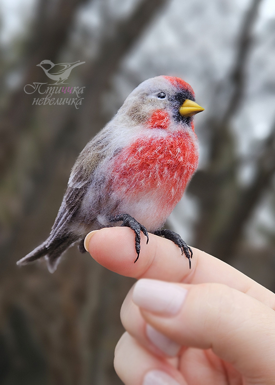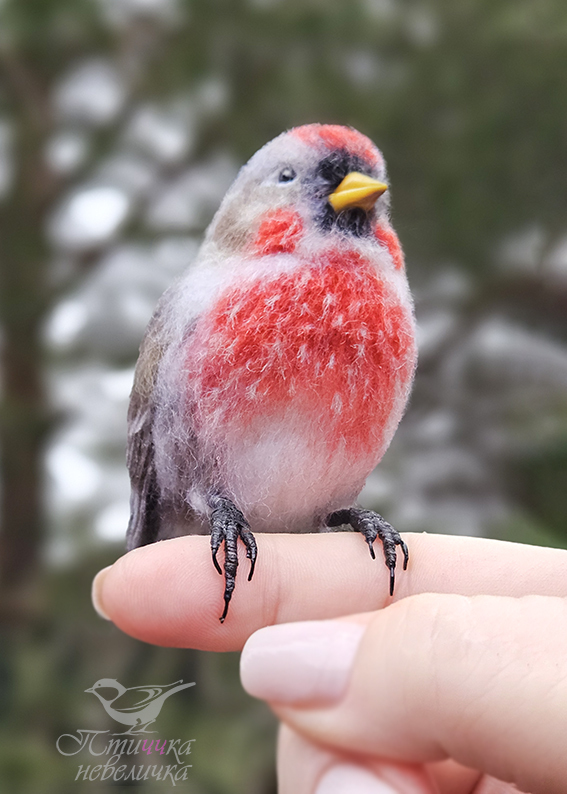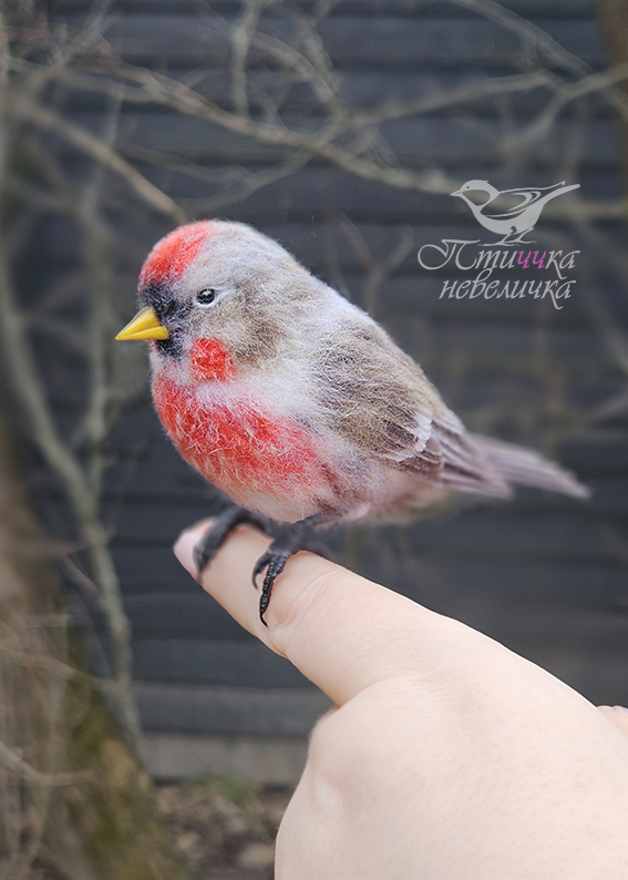 шерсть овечья, клювик из полимерной глины с росписью и лаковым покрытием, лапки на проволочном каркасе.