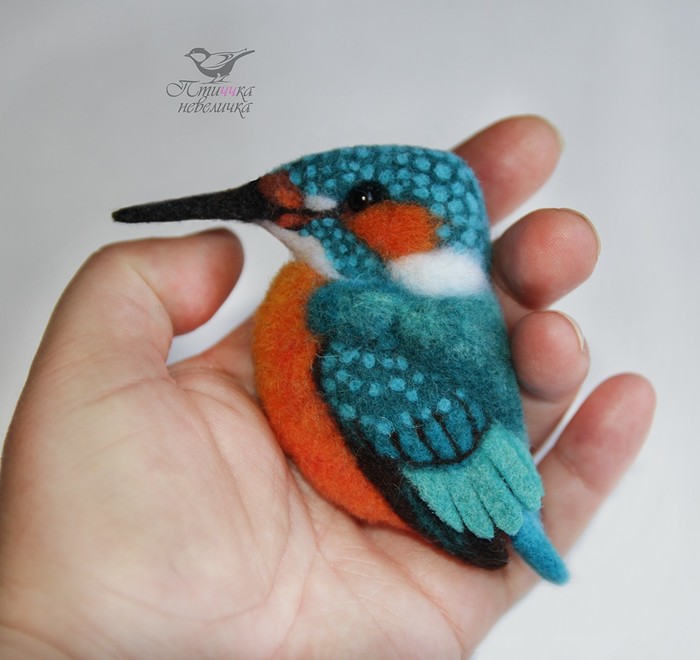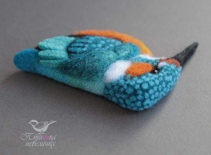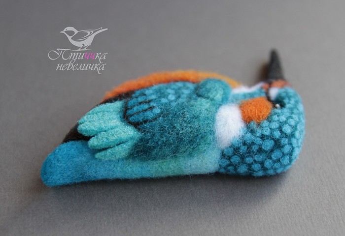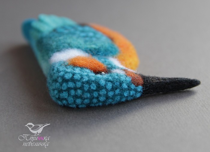 Ну, а если серьёзно, то это оказалась самая сложная из моих брошей: 3 оттенка оранжевого на пузике, 4 перехода цвета на спинке, 5 оттенков бирюзового ( шерсть красилась в ручную) и целая толпа млююююсеньких пятнышек.