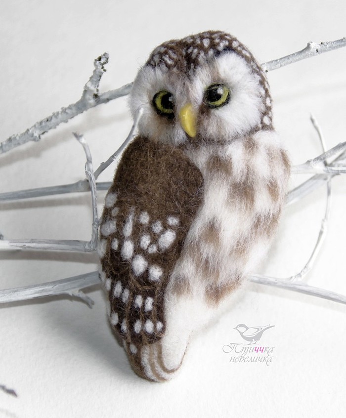 Материалы: овечья шерсть, глазик- бусина, клюв свалян из шерсти и пропитан специальным составом для прочности. Сзади застёжка для брошей.