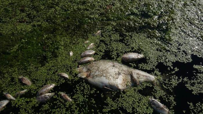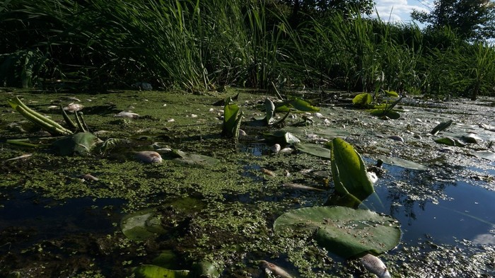 При том, что из-за жары содержание кислорода в воде и так уменьшилось.На участке, где погибла живность, течение, а значит и аэрация, слабые. Здесь много омутов, река делает петлю. Пешком идти один километр, плыть по усеянной всплывшей рыбой воде – три.