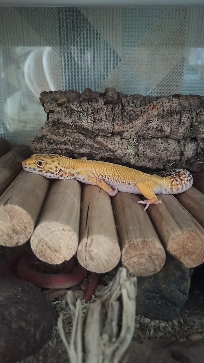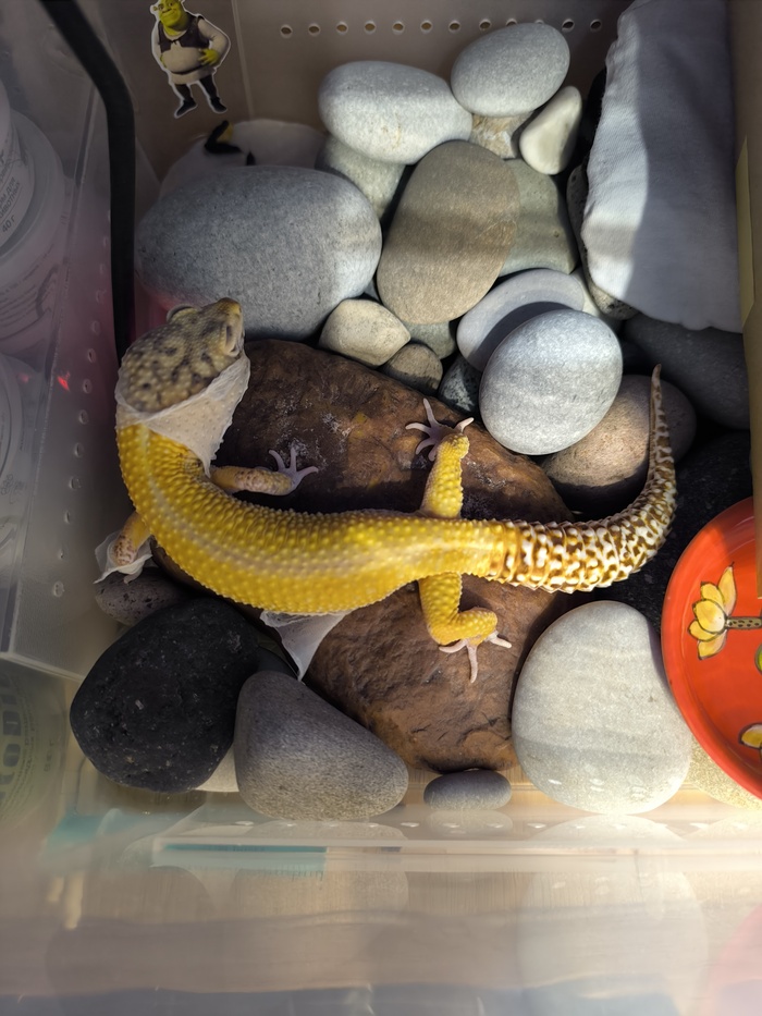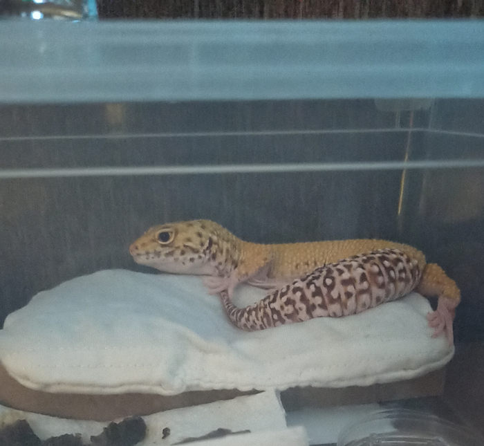 Ещё эублефары линяют и после линьки съедают старую кожу, чтобы восполнить запас витаминов. В каменистых пустынях каждый источник полезного на счету! С линькой им надо помогать, немного кожи может остаться на пальце или кончике хвоста, перекрыть кровообращение, и часть тела грустно отвалится. Мы помогаем ему раздеваться, если не спим, и после линьки всегда внимательно проверяем морду (особенно глаза), лапы и хвост на предмет оставшихся кусочков. Можно немного побрызгать зверя из пульверизатора, чтобы шкура размягчилась, проще слезала и не причиняла дискомфорт при снятии.