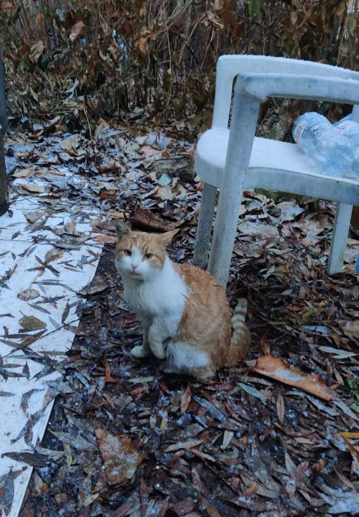 Помогите, пожалуйста пока не поздно спасти котика. Кот остался жить под небом. Живёт в картонной коробке, которая конечно не может согреть. Жители гоняют . Летом его кто то подкинул, но до сих пор никто не смог его взять себе 😭