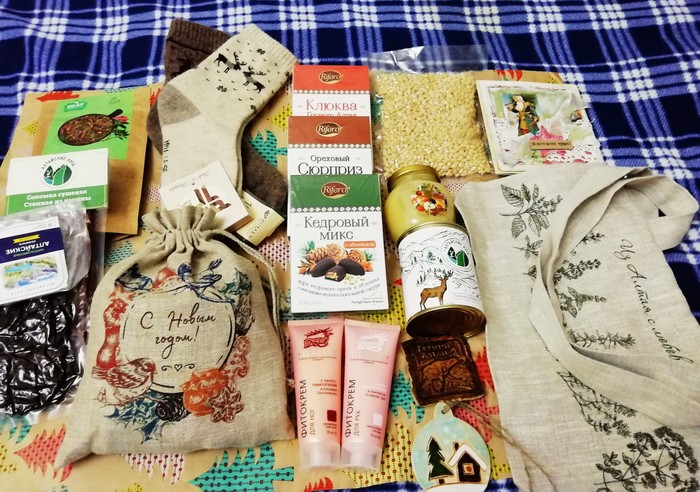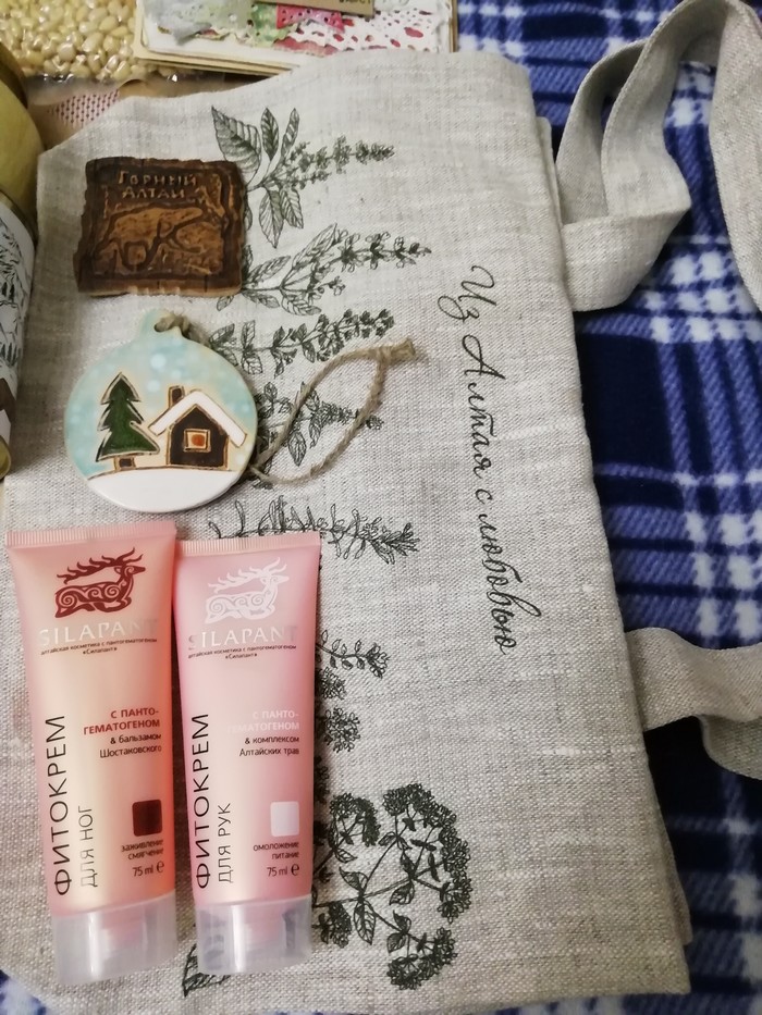 Сумка, магнит и красивая игрушка на ёлку. Отдельное спасибо за алтайские кремы для рук и ног, с удовольствием буду пользоваться.