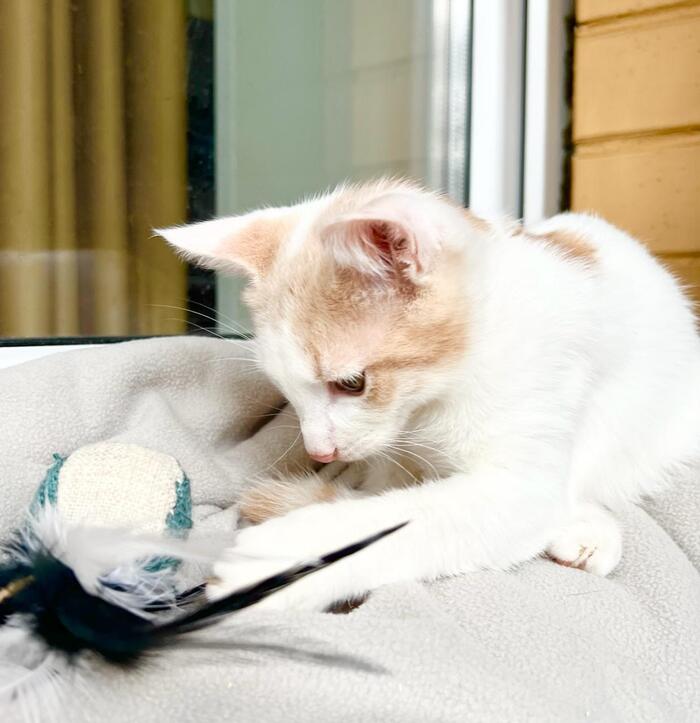 Но если вы думаете, что Мускат лежебока, то ошибаетесь. Этот кот, несмотря на свой внушительный размер, с удовольствием поиграет и побегает за игрушкой.