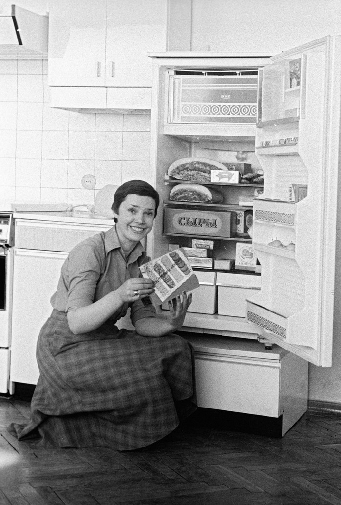 Легендарные холодильники Минского завода. "В них столько продуктов" - как-бы говорит нам девушка
