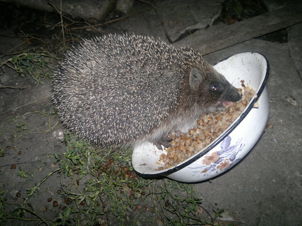 ЙОЖИК! наглая тварь отжимает кошкину еду, практически ничего не боится. кошка принесла мыль-полевку. сама есть не стала, ежик тоже побрезговал - так и валяется в миске - видно под ежиком. при попытка пальцем вернуть миску в нормальное положение огрызается, фыркает и матерится. живет где-то в саду, на семейном совете никаких решений не принималось - ему все равно на нас наплевать))