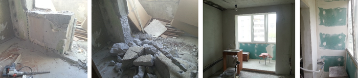 2. Чтобы объединить балкон с комнатой, просверлил много отверстий в стене и выломал ее. Вытаскивать весь этот бетон с 3го этажа оказалось труднее, чем ломать. Утеплил балкон и провел воду: вдоль всей комнаты прошла труба, которую в дальнейшем пришлось декорировать.