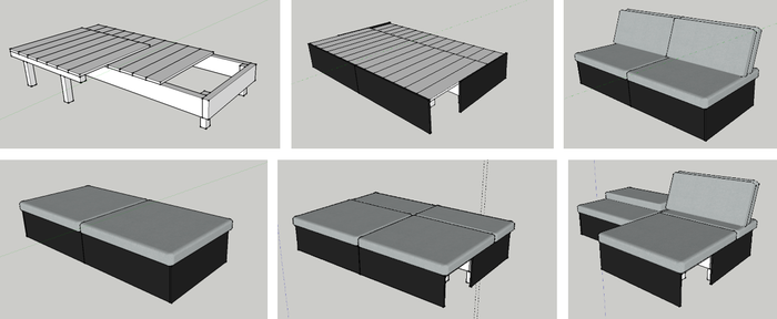 Конструируя диван, пришлось учитывать, что за ним проходят трубы, ведущие воду на балкон (кухню). Сделал его из крепких досок, ЛДСП, поролона и диванной ткани. Примитивный на первый взгляд механизм раскладывания позволяет использовать его в нескольких положениях как диван со спинкой, кровать, двуспальную кровать и какой-то гибрид дивана с кроватью). Внутри можно хранить вещи, которые не придется часто доставать, например, сноуборд летом или тот же велосипед разобрать на зиму.