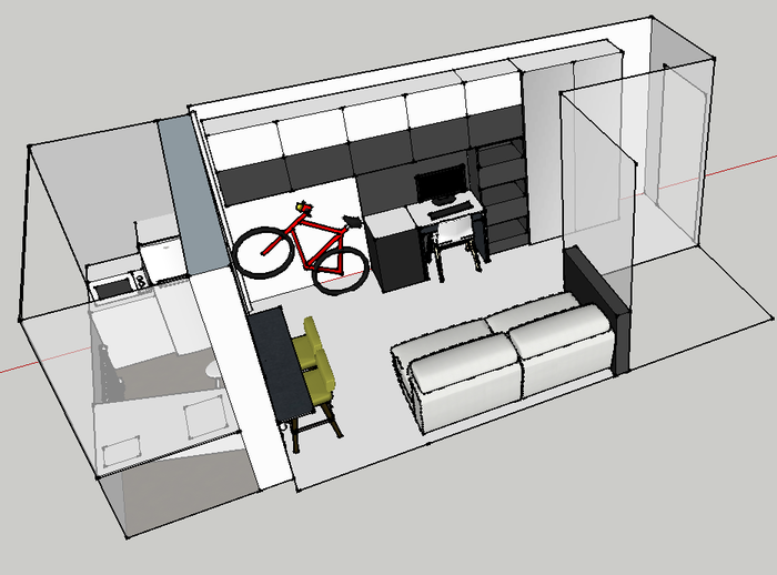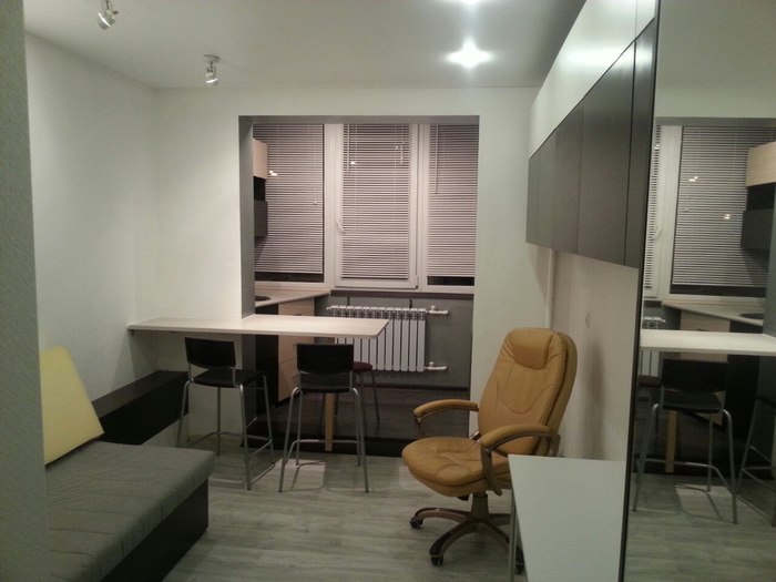 С детства любил компактные функциональные интерьеры, в которых все продумано и красиво сделано. Картинки с такими интерьерами я смотрел в журналах «Дом» в сельской библиотеке, потому что про Интернет у нас тогда не слышали. Кстати, про Интернет я узнал из журнала «Вы и ваш компьютер» в той же библиотеке, но история не об этом. Так вот, я продумывал эти интерьеры, представлял, как сделал бы сам, и по золотому правилу тренингов личностного роста (если, конечно, вы в них верите), лет через 15 мысли материализовались. Я вырос, уехал учиться в Екатеринбург, к окончанию универа накопил денег, еще занял у брата и мне хватило на небольшую комнатку с отдельным входом, балконом и возможностью подключиться к соседскому санузлу. Вот такую: