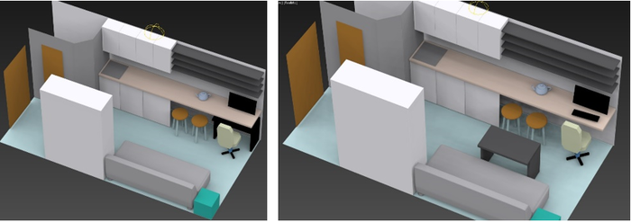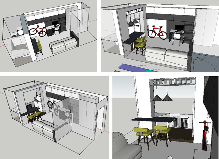 И так, наверное, для экономии места нам нужна большая столешница, плавно перетекающая из кухонной зоны в обеденную и в рабочую, с выдвижным столиком, который может перемещаться к дивану.