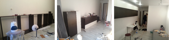 Параллельно развивается история с настенными шкафами. На третьем фото друг Паша, который помог поднять шкафы на стену.