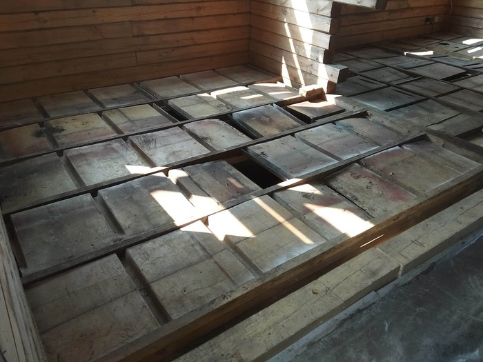 Доски не сгниют просто потому что пол всегда не просто теплый а очень теплый. Может быть даже горячий. Никаких хитрых вентиляций там нет. Просто пол поднят высоко чтобы был примерно на уровне поддувала печи или чуть выше. Хитрость эту я в последний момент узнал и высоту пола сделал как можно выше - ориентир был под самого высокого пользователя бани. В итоге доски просто очень хорошо просыхают