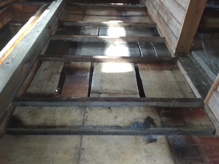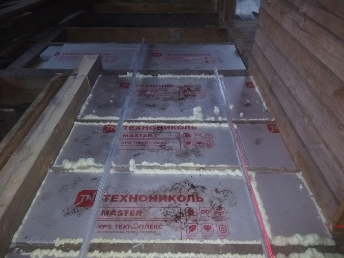 Утеплено перекрытие той самой злобной стекловатой, про которую персонаж мегафильма ДМБ Бомба рассказывал - на ту стекловату упал крановщик и зачесался до смерти. Вату эту я укладывал в защитной одежде очках и маске - и только как затянул сверху ветрозащитой - смог сфотографировать. Ваты навалено сантиметров 30. Почему так много - да потому что была, лежала у человека не нужной, уж больно матерьял адский и колючий.