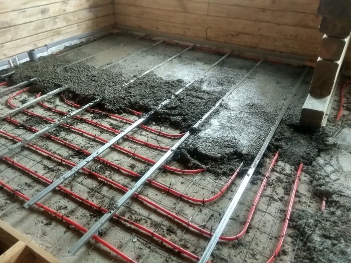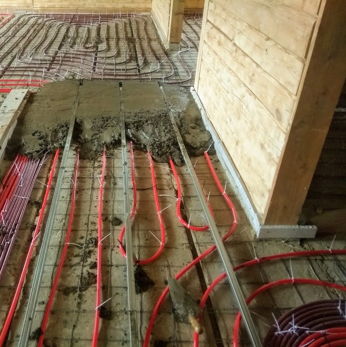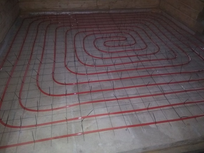 Накидываем сетку, зовем специалистов, они грамотно наматывают трубы теплого пола. По схеме улитка. Крепят к сетке стяжками. Затем так же накручиваю саморезы по уровню, ставлю маяки и заливаю дальше. Перепадов нет трубы теплого пола лежат в одно плоскости