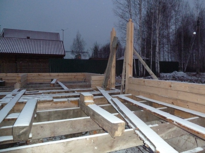 Далее делаем крышу. Конструкция очень простая - двускатная крыша, стропила упираются в балки перекрытия. Само перекрытие накрывает еще место рядом с баней - там у меня потом будет рабочее пространство и верстак под крышей.