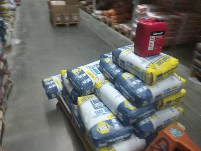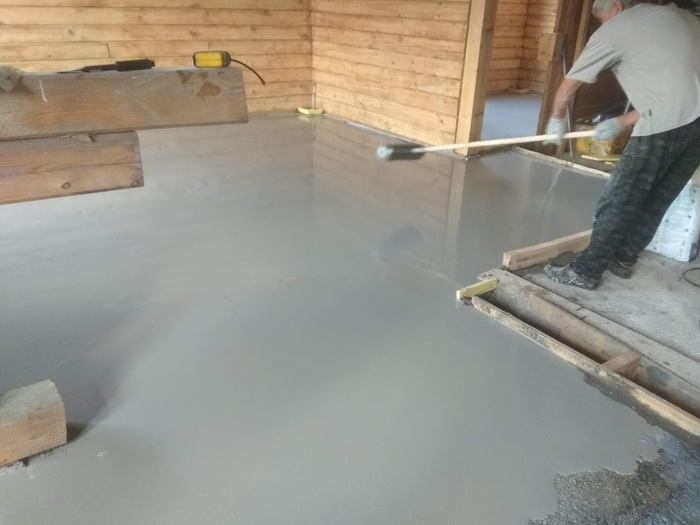 Бетон материал пыльный, поэтом сверху залили его нивелирущим полом. Процесс непрерывный - делался за раз - мешков взял с запасом, но все что не потратил вернул в тот же день. Пол предварительно обеспылил, и промазал грунотовкой.