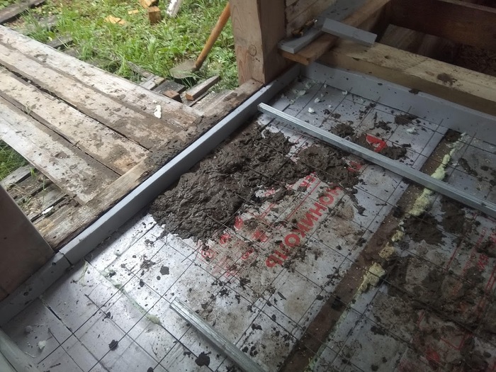 Готовим пол к заливке - набиваем черепные бруски и укладываем или бросовой пиломатериал - который все равно обрабатывал огнебиозащитой или пластик от обшивки, который мне по случаю достался бесплатно