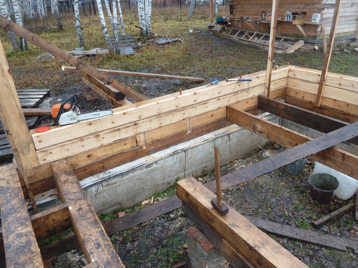 Выкладываем ряды из бруса. Брус предварительно антисептируется огнебиозащитой. Фаску снимаю рубанком и только одну - снаружи сверху, брус даже не шлифую - а надо было внутри хотя бы
