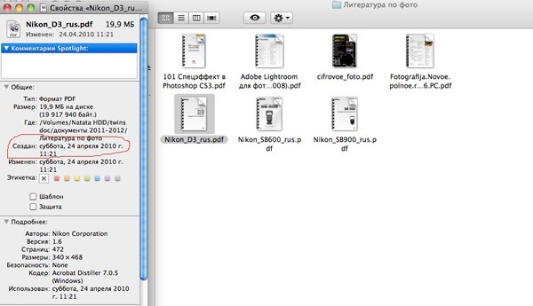 По месту обыска изъяли стопку DVD, на которых следователь не смог найти ничего интересного. Возможно, потому что владелец пользовался Mac OS, а у следователя был Windows. Но Сергей и Наташа, взяв домой эти диски, обнаружили на них немало интересного. Например – скачанную на следующий день после нападения, 24 апреля 2010 года (дата есть в свойствах файла), инструкцию Nikon D3. Двумя днями позже владелец DVD скачал инструкцию к вспышке SB-900 (такую же украли у Втюриной). А еще там были домашние снимки, сделанные тем же фотоаппаратом: экран монитора, на котором открыта инструкция к D3 (фото датировано 7 мая 2010 года). Было похоже, что человек получил камеру в руки, скачал к ней инструкцию и, разбираясь, делал пробные снимки. В EXIF этих снимков остались следы тех же объективов и фотовспышки, что были похищены у Втюриной. Были там и старые фотографии, предположительно сделанные Александром Гавриловым: еще 23 апреля, в день нападения, он фотографировал свою девушку на более простой Canon 40D. А 12 мая 2010 года под одним из никнеймов, используемых Гавриловым в Интернете, было опубликовано объявление о продаже Canon 40D. Видимо, старый фотоаппарат по какой-то причине стал не нужен.