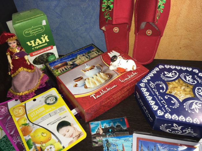 Дальше: несколько магнитов и красивейшая шкатулка с видами Казани. И на этом чудеса не закончились. Нас еще ждали кукла в татарском национальном костюме, сувенирный котик в тюбетейке, и тапочки!!! Потрясающие тапочки (уже носятся с огромной благодарностью).