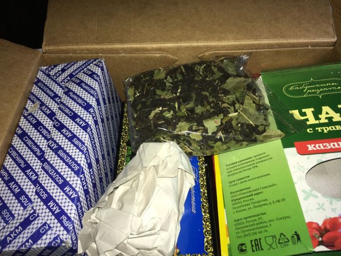 Во-первых, казанский чай с травками, а к нему вкусняшки: чак-чак и и талкыш калеве (ручной работы потрясающие нямки).
