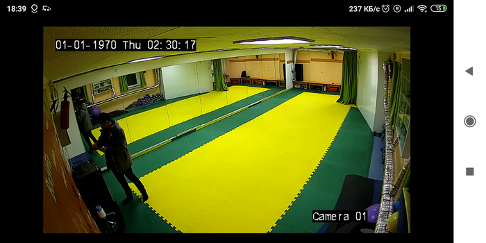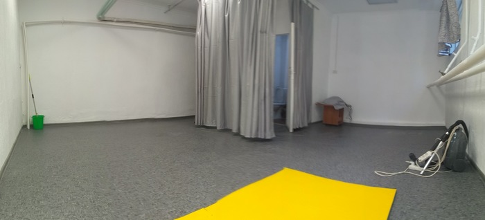 а это большой зал для групповых занятий, раздевалка - тоже часть зала, отгораживается зелёной шторой, переоделись и пахать))