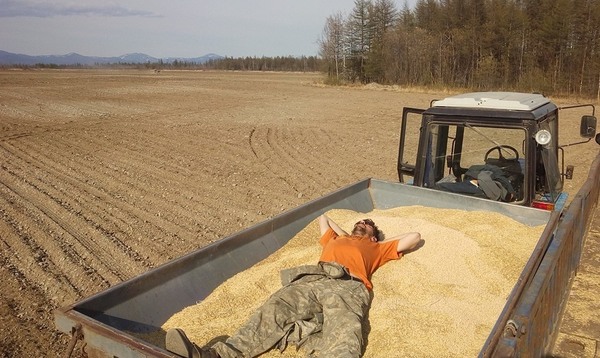 В целом у нас все как у фермеров по всей стране: времени мало, топлива мало, запчастей нет, людей нет... Ну что рассказывать? Что у нас есть? Земля и комары. На фото ниже май месяц. Когда большая часть страны уже смотрит на девушках в юбочках - мы ещё ходим вечером на работе в бушлатах.