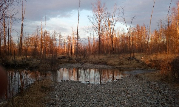 А по этому фото можно вообще решить, что это осень. Я на этом ручейке не раз ночевал. Расстояния между концами участков полей 35 км, пока доедешь - уже глубокая ночь, поэтому я прямо тут разводил костерок, чайник, баночка каши. Ляпота.