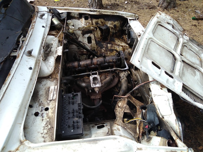 Что мы видим? Двери и капот вскрыты, кто-то уже побывал внутри не один раз, моторный отсек пока ещё цел, но аккумулятор отсутствует.