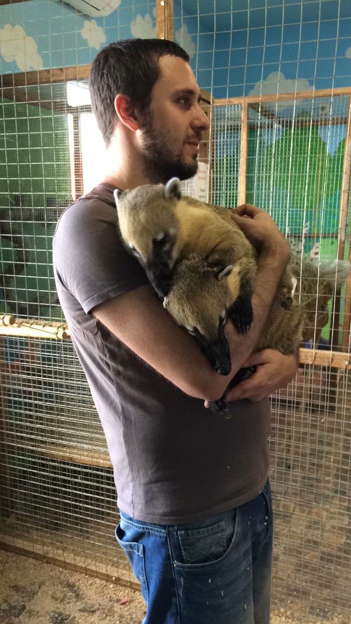 Первый носух ловко забрался мужу на руки, аккуратно прикусив ему руку в районе сгиба, второй позже забрался на спину и пытался расцеловать...